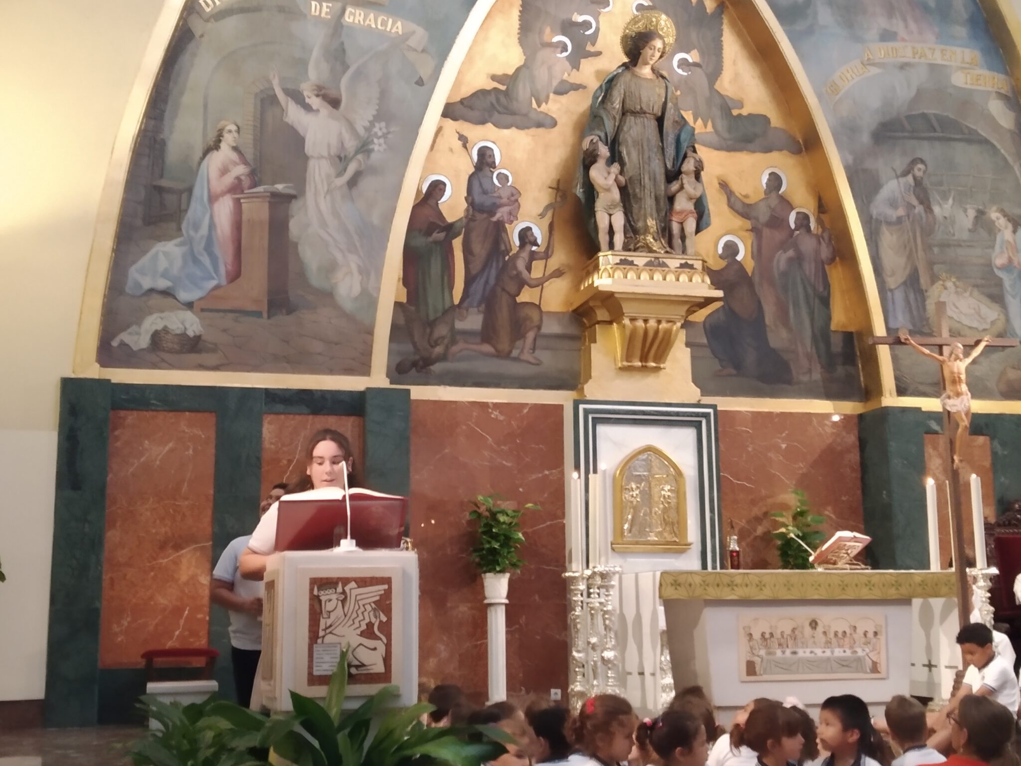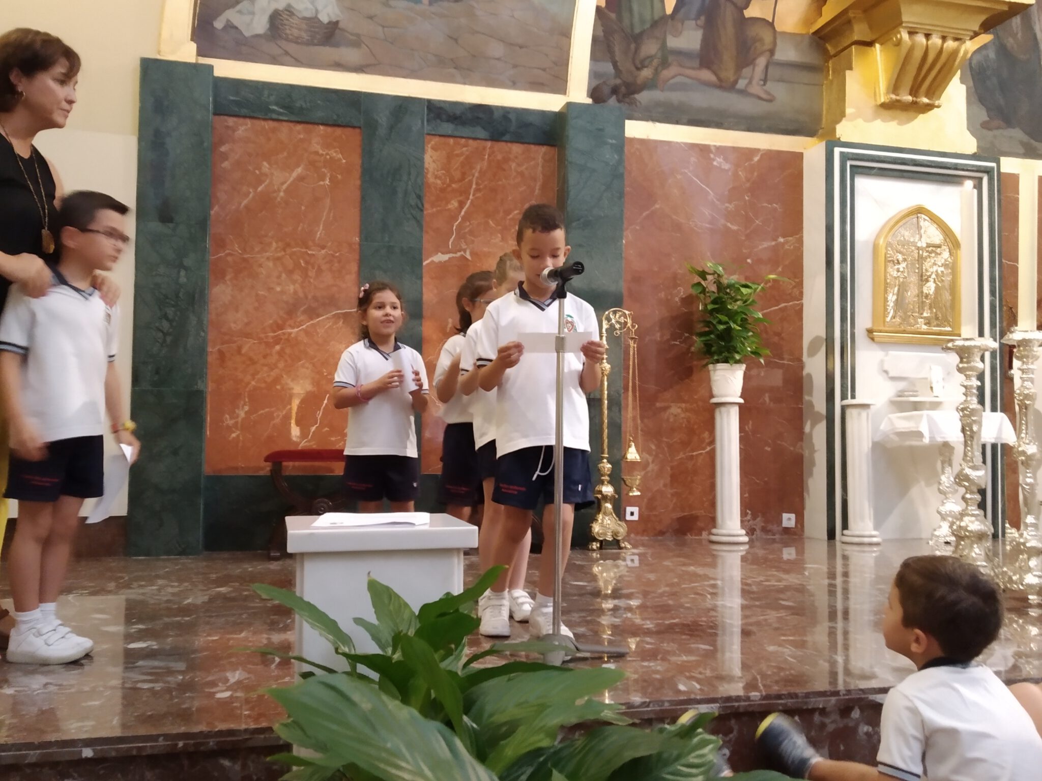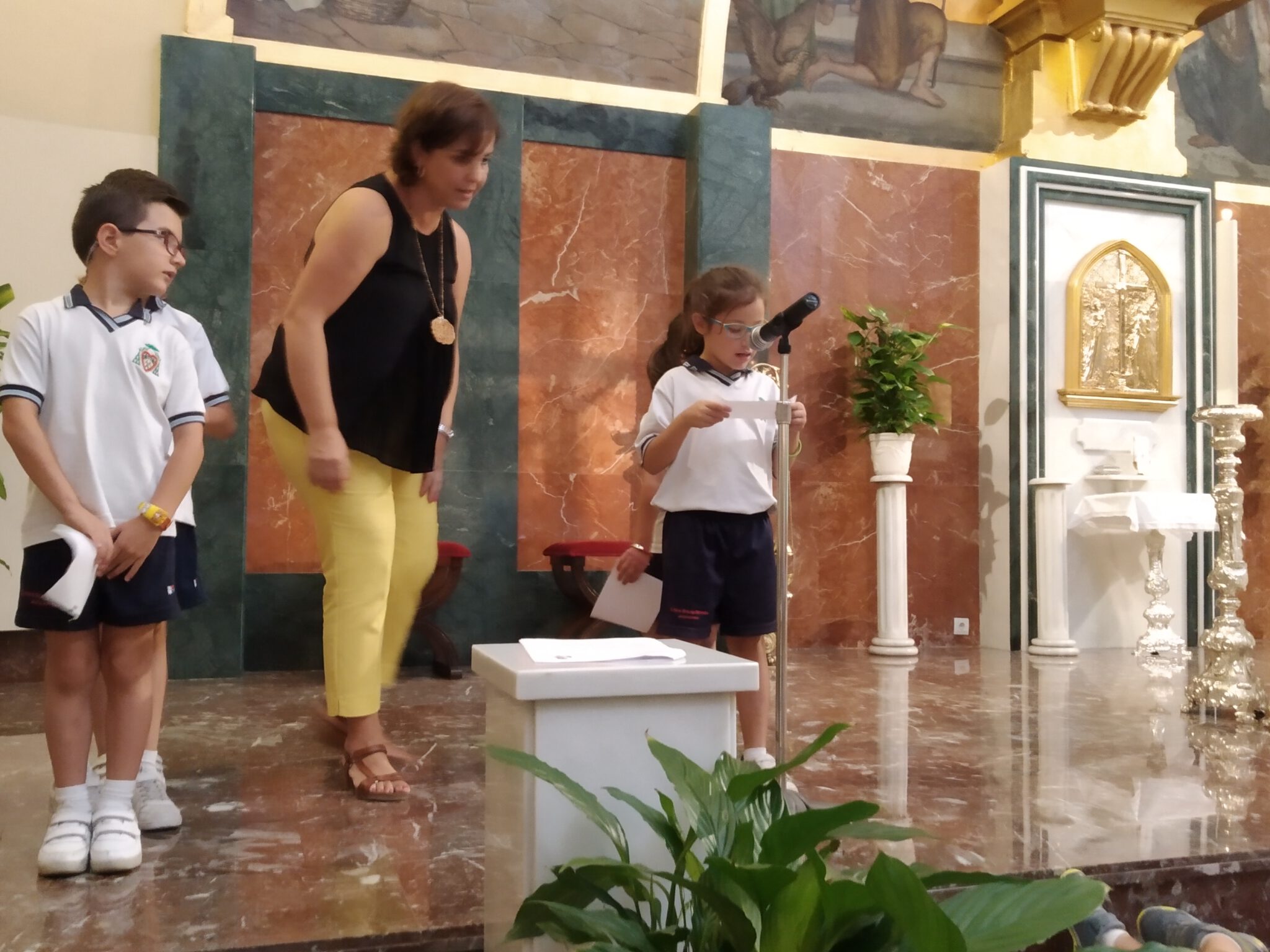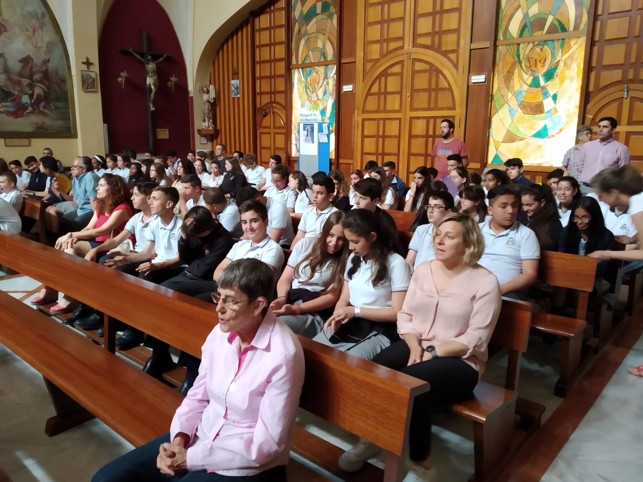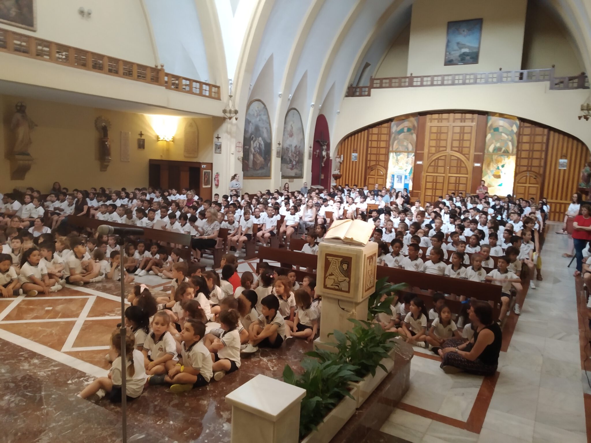 “Hoy, Señor, en este día todos los alumnos te damos gracias por tu constante presencia en nuestras vidas, porque nunca nos abandonas y siempre podemos contar contigo. Te damos gracias también por los buenos momentos vividos a lo largo del curso y también por los errores cometidos que nos han ayudado a crecer. Te damos gracias por nuestras familias que nos guían día a día por el buen camino, y también te damos gracias por nuestros profesores, por su generosidad, por estar ahí siempre para ayudarnos a crecer por dentro. Gracias por nuestros amigos y compañeros, con los que compartimos aula, juegos y trabajo. Y gracias por enseñarnos que en María tenemos un ejemplo para seguir a Jesús.”