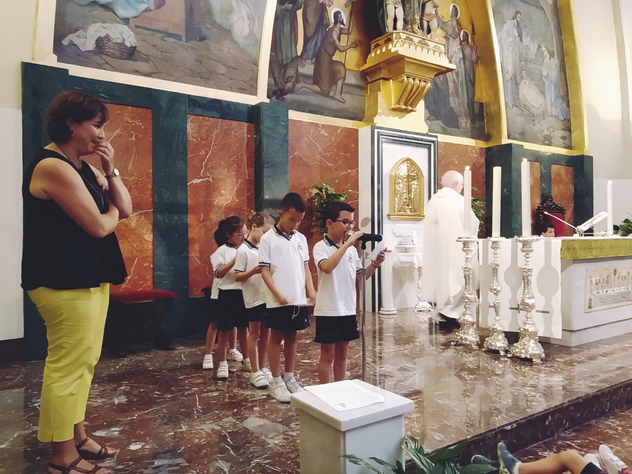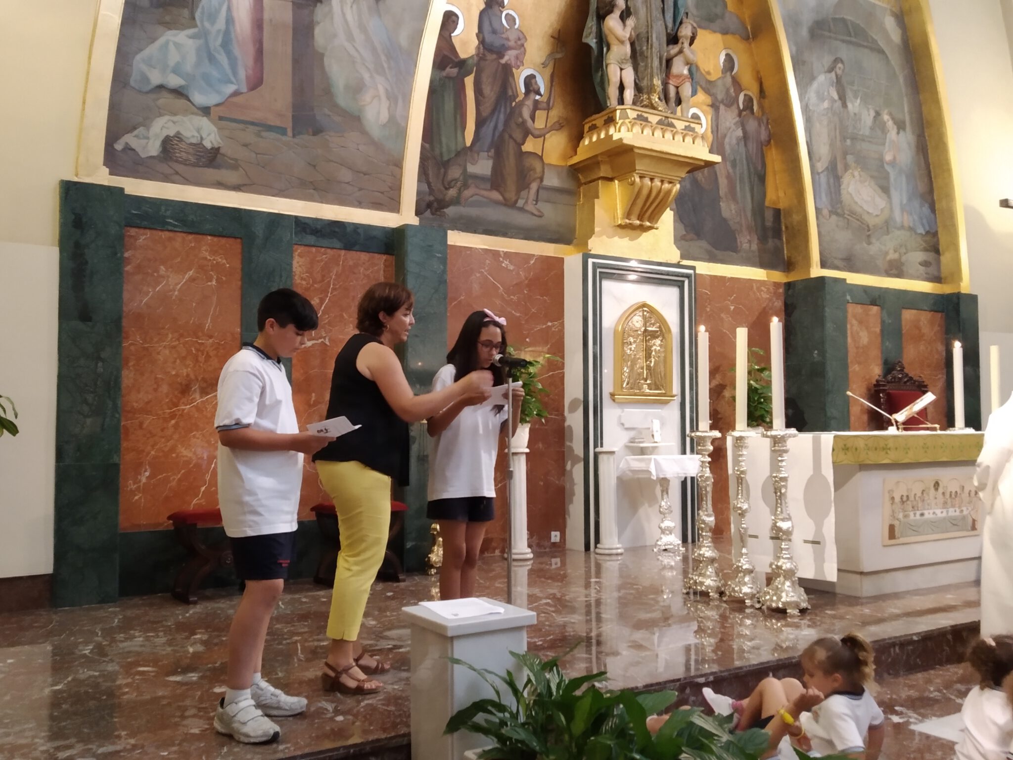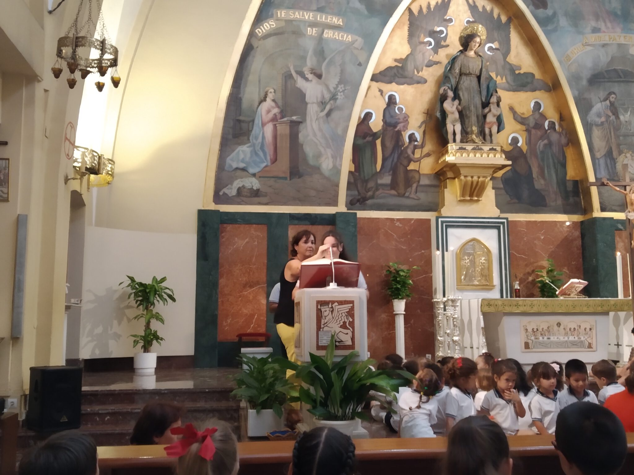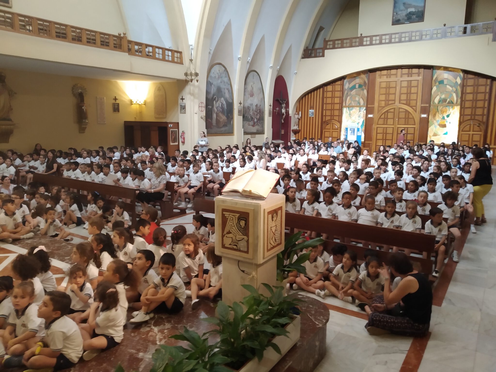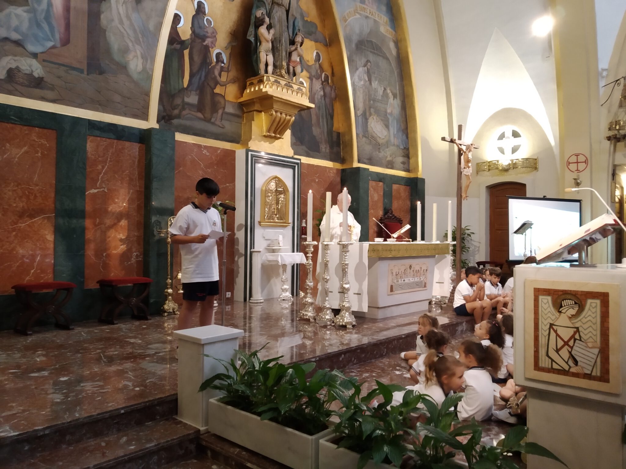“Hoy, Señor, en este día todos los alumnos te damos gracias por tu constante presencia en nuestras vidas, porque nunca nos abandonas y siempre podemos contar contigo. Te damos gracias también por los buenos momentos vividos a lo largo del curso y también por los errores cometidos que nos han ayudado a crecer. Te damos gracias por nuestras familias que nos guían día a día por el buen camino, y también te damos gracias por nuestros profesores, por su generosidad, por estar ahí siempre para ayudarnos a crecer por dentro. Gracias por nuestros amigos y compañeros, con los que compartimos aula, juegos y trabajo. Y gracias por enseñarnos que en María tenemos un ejemplo para seguir a Jesús.”