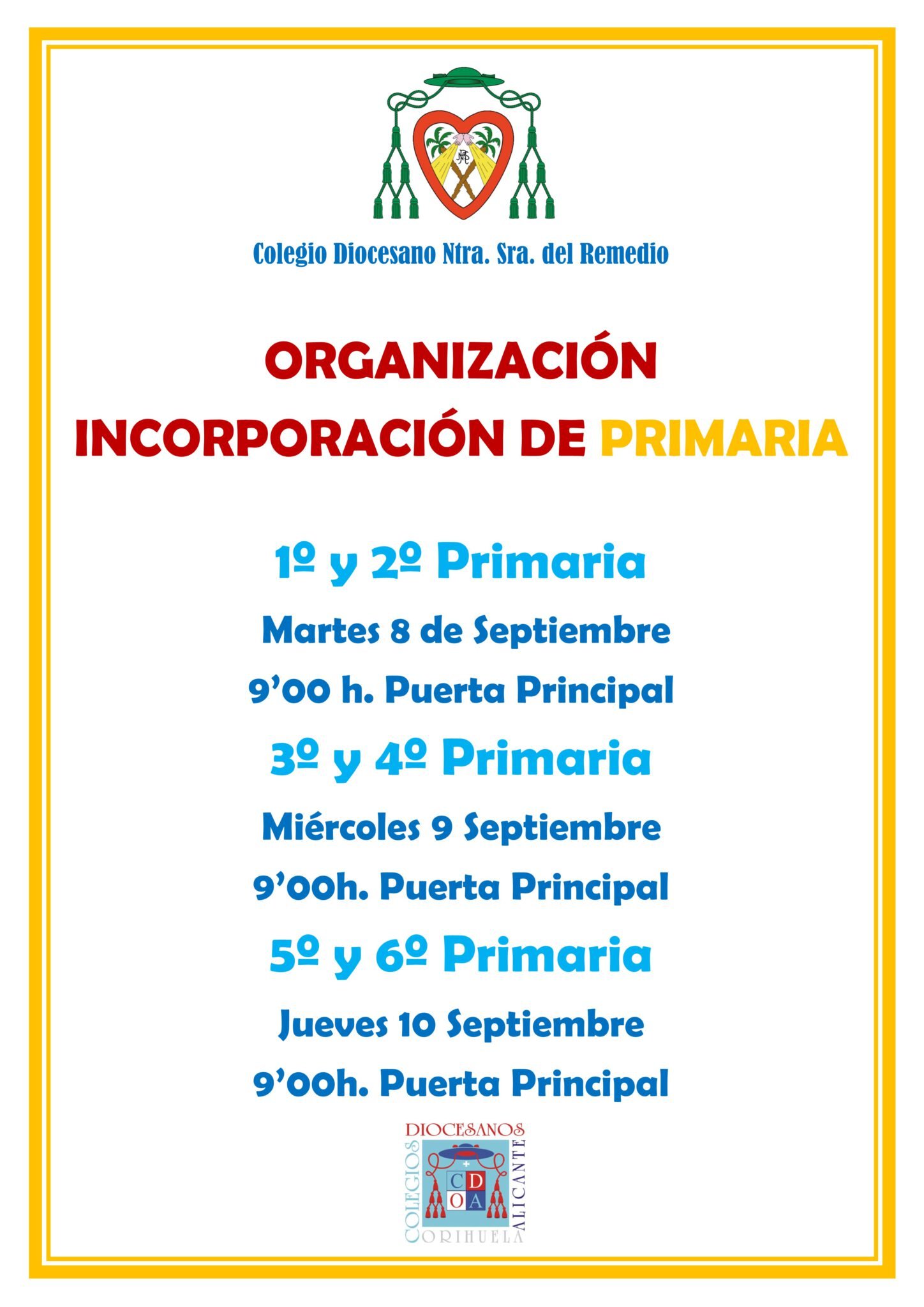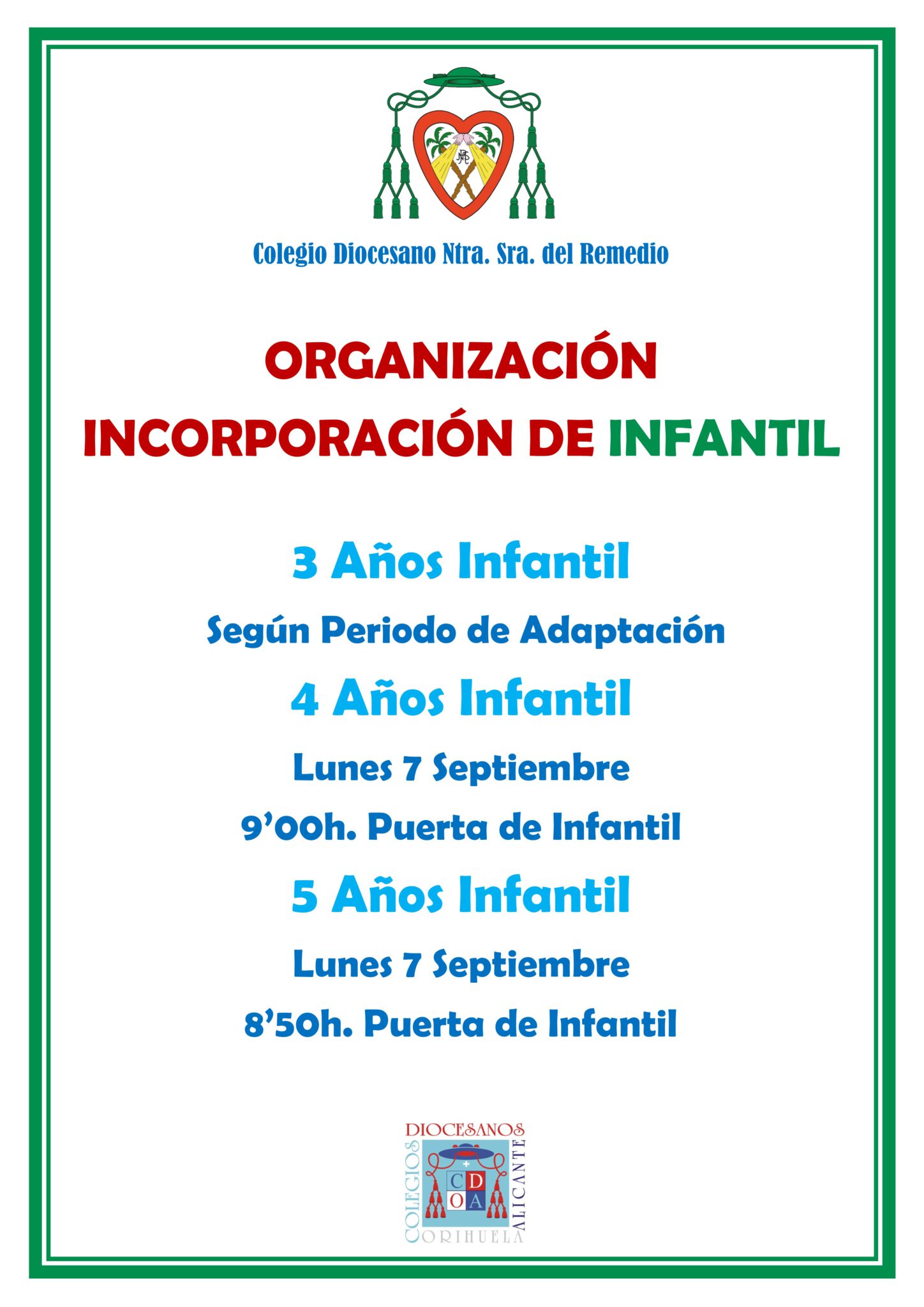 Es por ello que a continuación les mostramos cómo el centro ha organizado la incorporación del alumnado al curso 20-21. Les rogamos respeten escrupulosamente dicha organización. Sobra decir que una vez que sus hijos se incorporen al centro según organización, deberán asistir al mismo diariamente (a excepción del alumnado de INF 3 AÑOS ya que la incorporación de este alumnado al centro sigue pautas diferentes debido a que se encuentran en su periodo de adaptación al mismo).