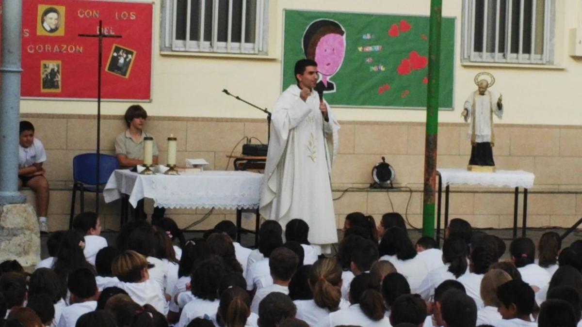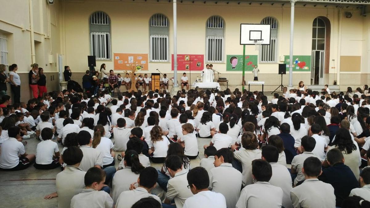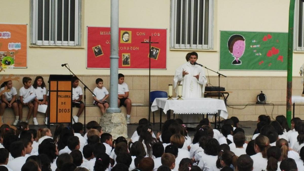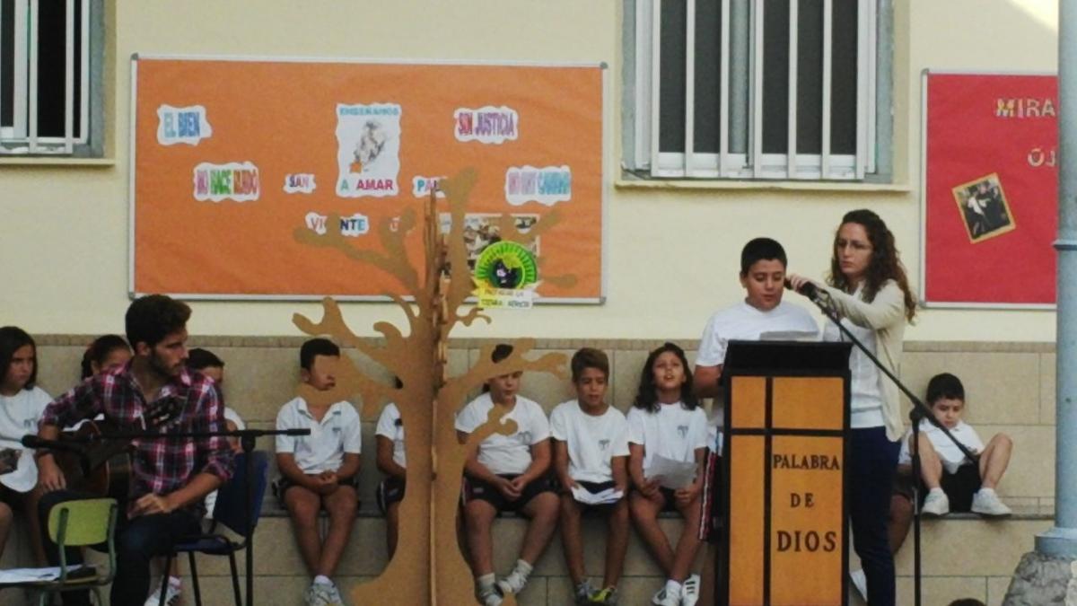 ¡Nuestro Cole está de fiesta! Se nota porque el patio comienza a llenarse, todos los alumnos y las alumnas se sientan poco a poco, delante los más pequeñitos y al fondo los mayores, como siempre. Todos y todas miran hacia un mismo lugar, el altar que se ha preparado en el patio, la mesa donde vamos a compartir el milagro de la Eucaristía, que hoy además tiene un invitado de lujo. A un lado del altar, la figura inconfundible de San Vicente parece observar a esos niños y niñas, incluso parece que les sonría, o que les vaya a decir algo.