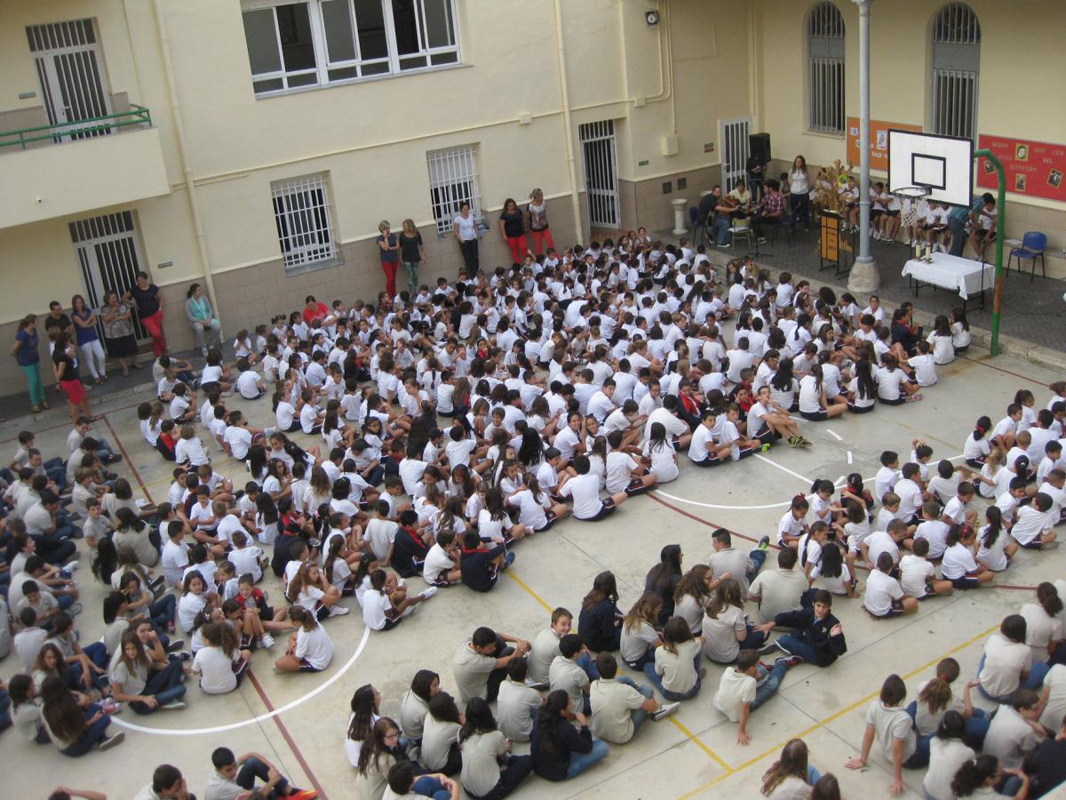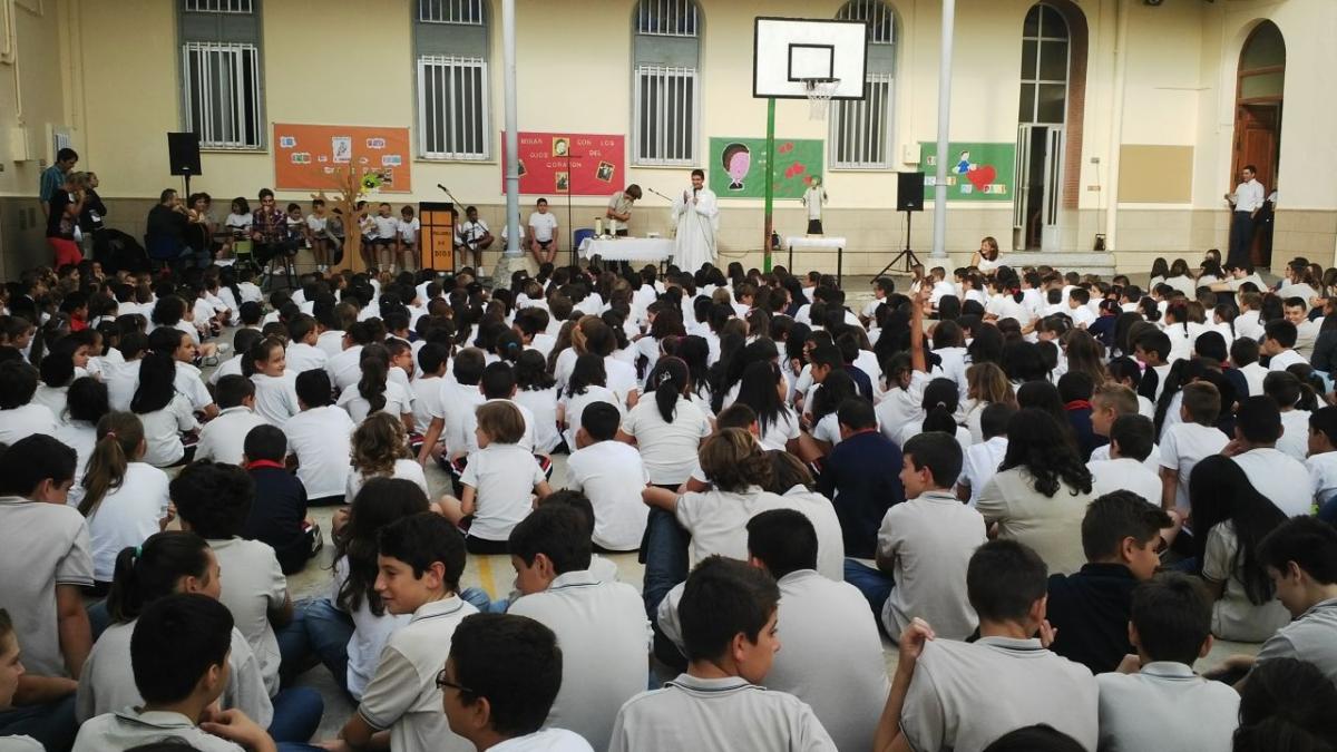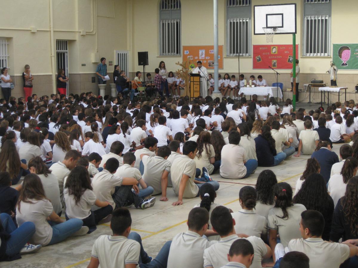 ¡Nuestro Cole está de fiesta! Se nota porque el patio comienza a llenarse, todos los alumnos y las alumnas se sientan poco a poco, delante los más pequeñitos y al fondo los mayores, como siempre. Todos y todas miran hacia un mismo lugar, el altar que se ha preparado en el patio, la mesa donde vamos a compartir el milagro de la Eucaristía, que hoy además tiene un invitado de lujo. A un lado del altar, la figura inconfundible de San Vicente parece observar a esos niños y niñas, incluso parece que les sonría, o que les vaya a decir algo.