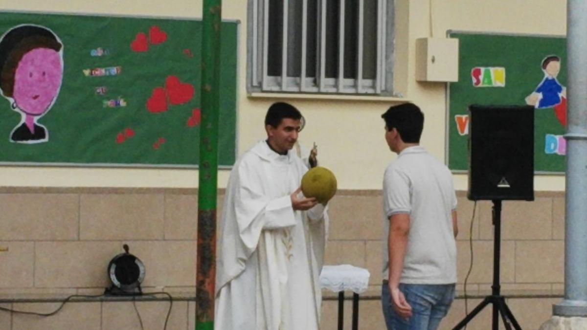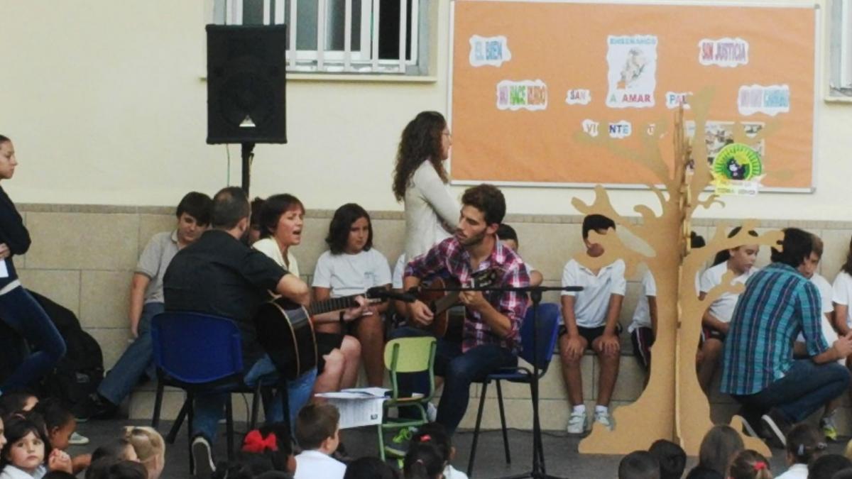 Y se nota la fiesta porque al otro lado las guitarras se preparan, y el árbol dónde colgamos los frutos que iremos trabajando este curso, y la presencia del sacerdote para bendecir y celebrar este día. Sí, está claro: hoy es un día de fiesta.